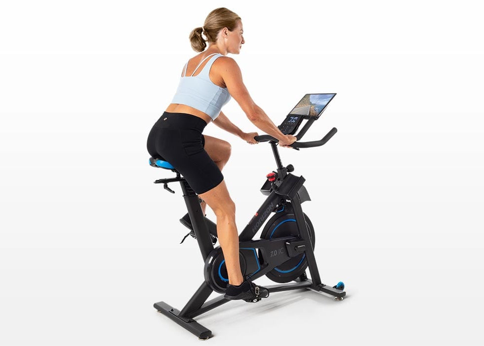 Bring the studio home on the Horizon 7.0 IC connected fitness bike. Simply pair your phone or tablet via Bluetooth and keep pace with your favorite cycling classes using 100 electronically controlled resistance levels. The included Bluetooth heart rate band, dual water bottle holder and clip in pedals offer all the extras for fully immersive workouts with the apps you love.